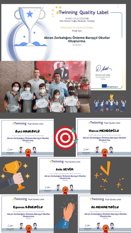 2021 - 2022 Eğitim Öğretim Yılında 3 öğretmenimiz tarafından yürütülen 2 eTwinning Projesi Ulusal Ajans tarafından Kalite Etiketine layık görülmüştür. Projelerde okulumuzu en iyi şekilde temsil ederek büyük birer gayret gösteren Müdür Yardımcımız Ahmet Ufuk ÖZDEMİR'e, Rehber Öğretmenimiz Duygu TANIR'a ve Okul Öncesi Öğretmenimiz İsmet DEVECİ'ye ayrıca projelerde aktif bir şekilde tüm çalışmalarda yer alan öğrencilerimize ve velilerimize verdikleri emeklerden dolayı teşekkür ederiz.